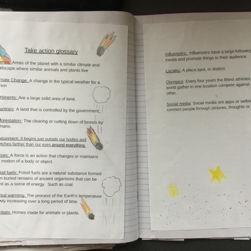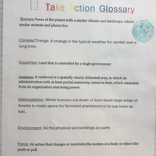 As part of our literacy work we have been looking at what a glossary is and how it can be used to help us understand certain subjects. We created our own glossaries for Take Action! We hope that these will help throughout the term.