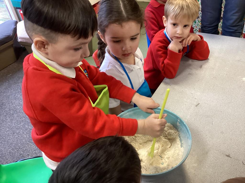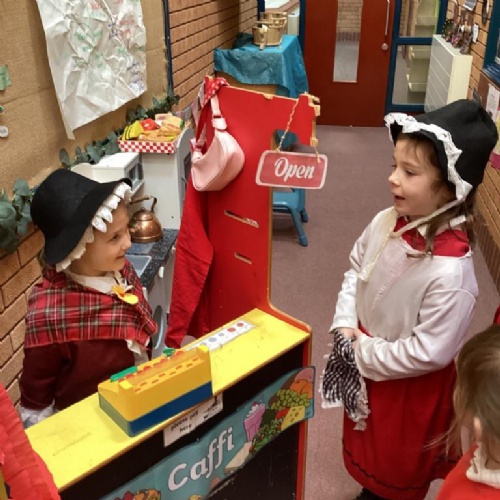We then looked at Wales as the country in which we live. We started by looking at Llandrindod Wells and the important features of our town. We used Google Maps to find places we recognise, and places we enjoy visiting. We collaged a big map and labelled places of interest. We enjoyed traditional welsh dress in our 'Caffi Cymraeg' and baked welsh cakes.